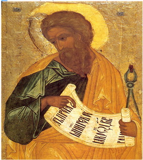 The Icon of Isaiah is from the Novgorod Museum in Russia. It originally came from the Cathedral of the Nativity of the Mother of God in the Monastery of St Anthony in Novgorod. Isaiah is shown holding an open scroll on which are written the words of his prophecy: "I foretell that you will be born of the Virgin" His right hand points to the scroll, while in his left hand he holds tongs, a symbolic attribute alluding to the vision which marked the beginning of his ministry as a prophet.