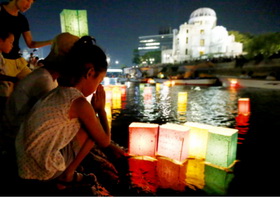 period. It shows the release of coloured lanterns on the Motoyasu river that