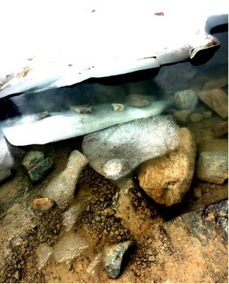 glacier. Through the clear and very cold water you can see the stone grit and